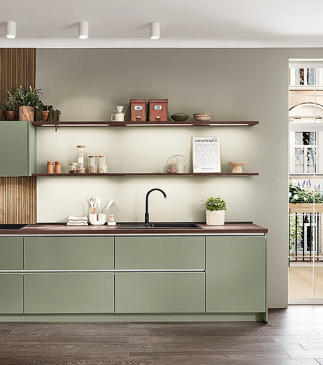Природа с ее широким спектром материалов и цветов является идеальным источником вдохновения для нашего дизайна кухни. В сочетании с прочной столешницей из миланского ореха, концепция тон в тон в оливковом цвете создает идеальный баланс между современностью и связью с природой. Темная облицовка ниши Stripewood усиливает уютное очарование с помощью удивительно аутентичного деревянного декора, делая это естественное пространство, в котором вы можете провести драгоценное время с близкими.